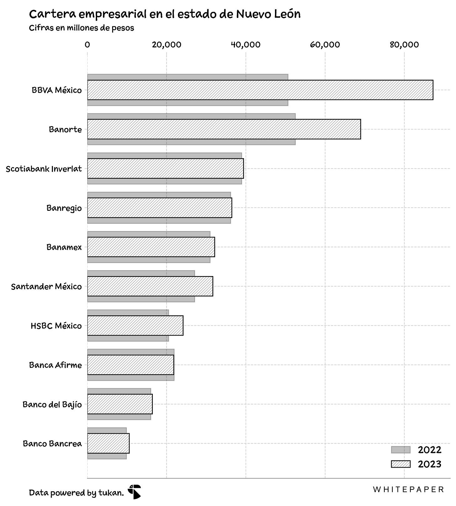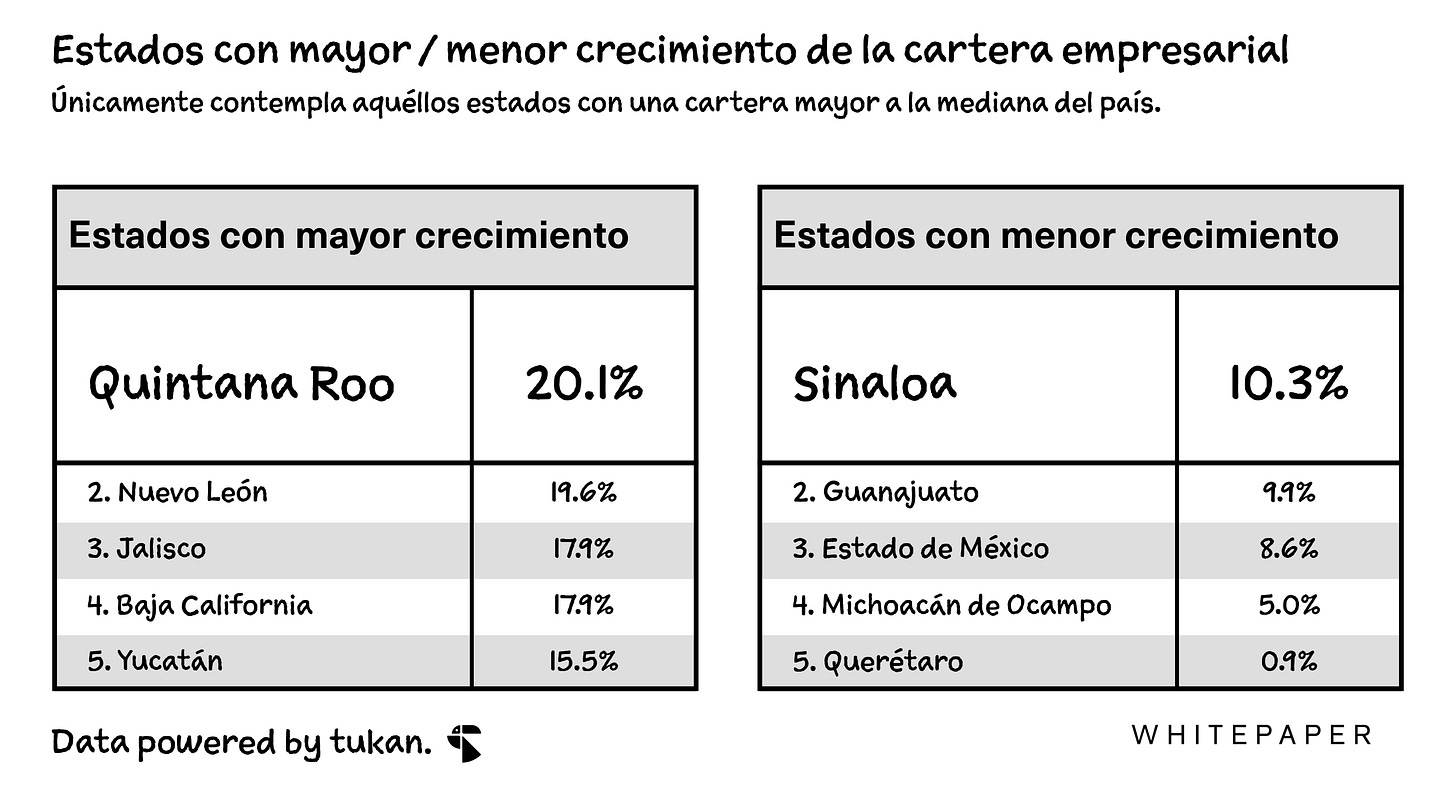 Para el estado de Nuevo León, resalta el caso de BBVA, quienes crecieron su portafolio en más de 72% respecto al año anterior — superando a Banorte como el banco con mayor presencia en los créditos empresariales de la entidad; esto a pesar de que este último incremento su cartera por encima del 30% durante el año.