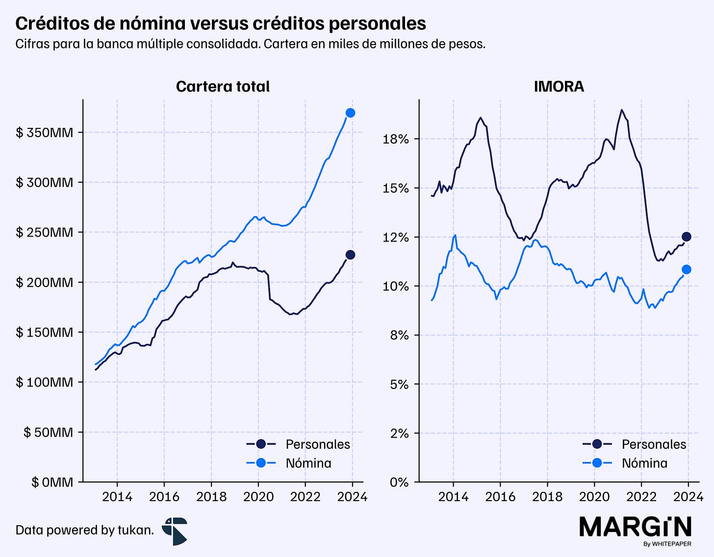 Según datos de la CNBV, a finales del 2013 la cartera de crédito personal y de nómina habría sido, más o menos, del mismo tamaño. Sin embargo, durante los últimos 10 años el crédito de nómina creció a una TCAC del 10%, mientras que el portafolio de créditos personales habría aumentado a una TCAC del 6%. Al día de hoy hay una diferencia de más de $140 mil millones de pesos entre el saldo de ambos productos.
