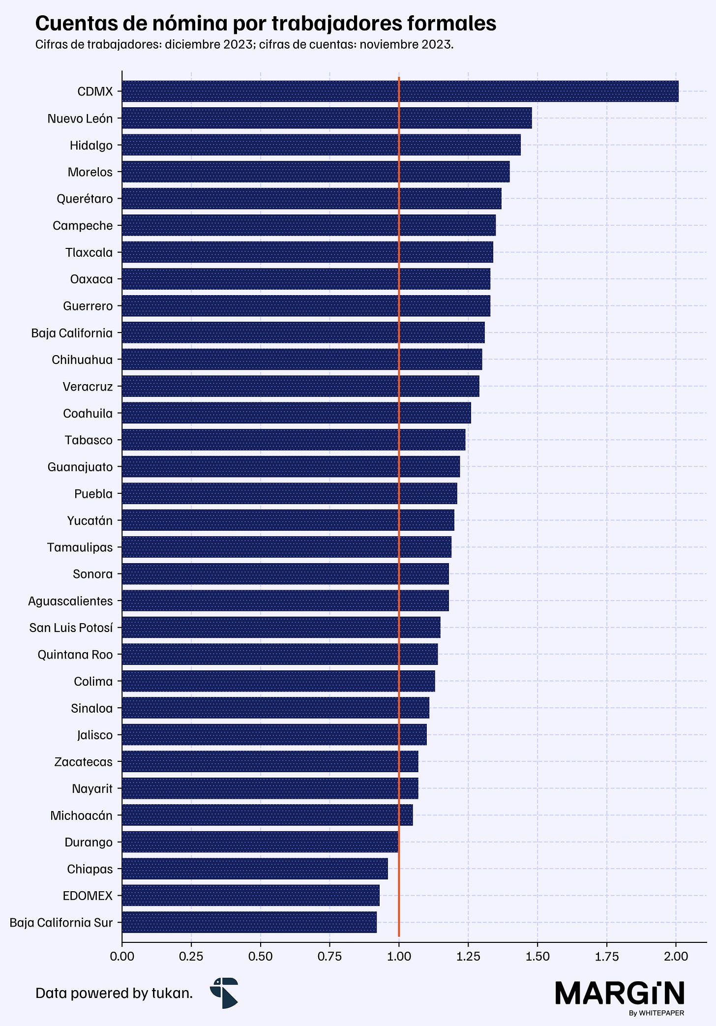 En México existen poco más de 34 millones de cuentas de nómina activas, lo que sería algo así como 1.3 cuentas bancarias por cada trabajador formal. Desde una perspectiva estatal, sólo 3 estados tienen menos de 1 cuenta (de nómina) por cada trabajador formal.