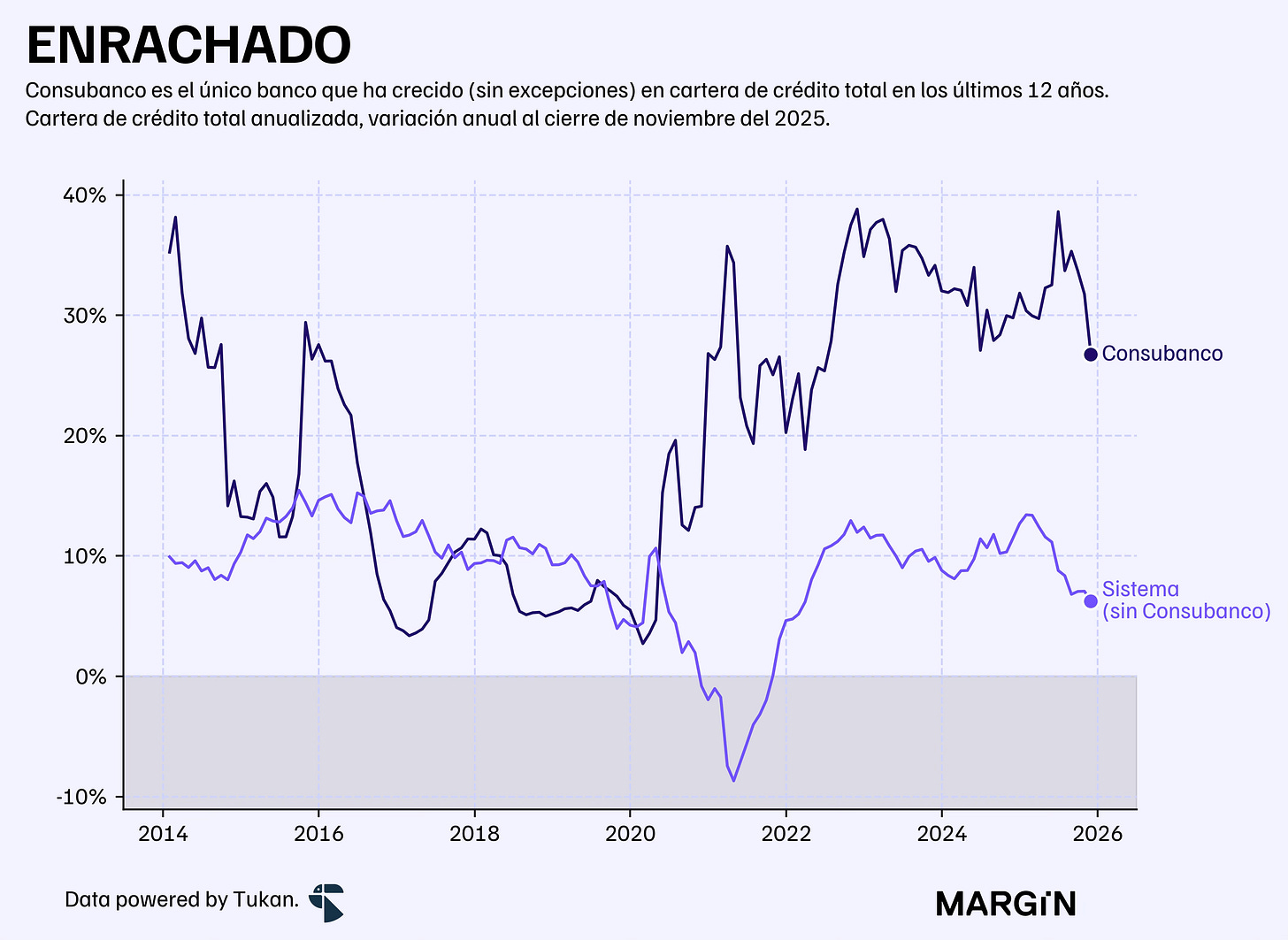 Esto se traduce en más de 12 años de expansión ininterrumpida para la institución bancaria, llevando su cartera de crédito de $3,800 millones en 2013 a más de $31,800 millones en noviembre del año pasado.