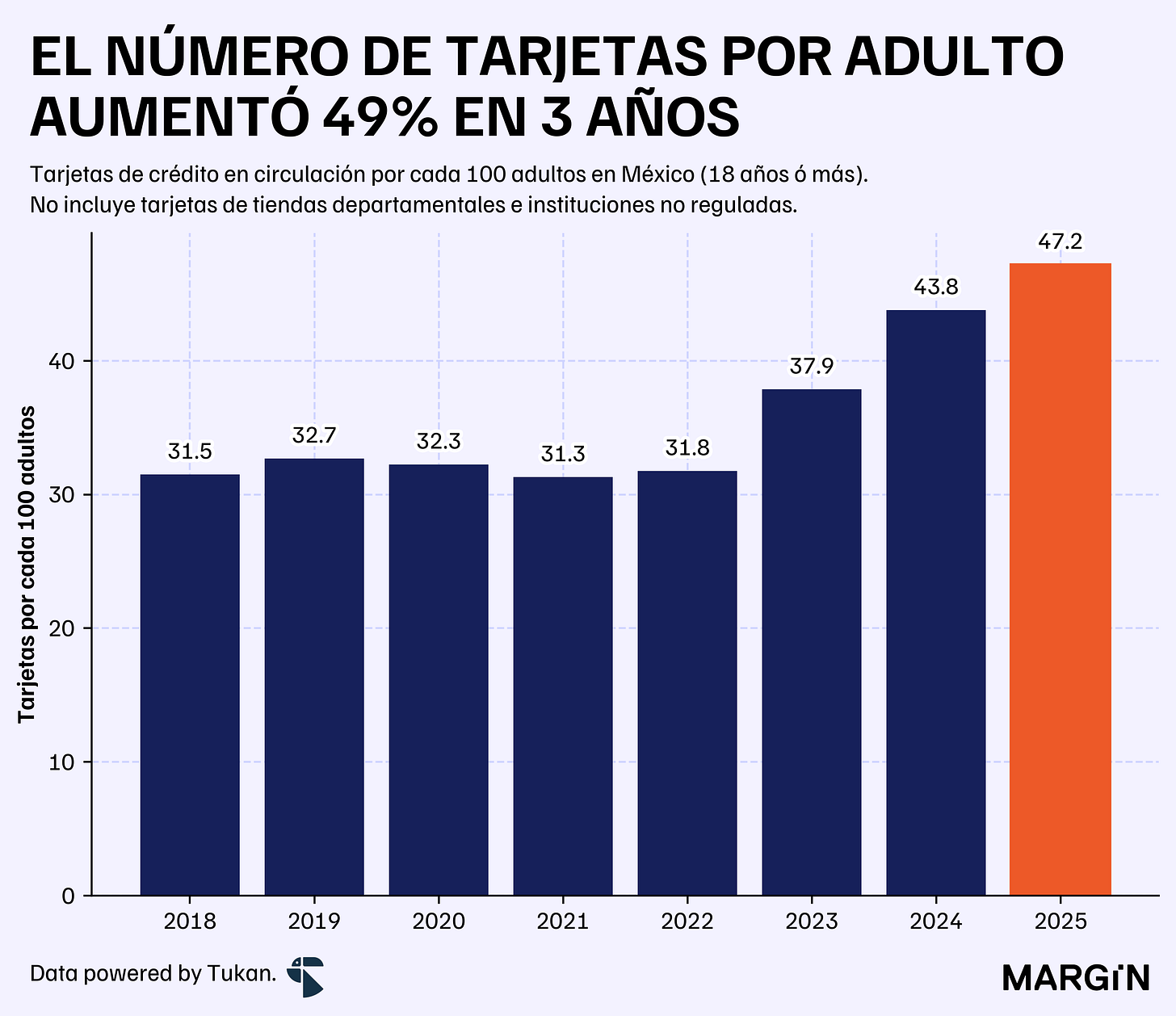 La última década se ha caracterizado por una intensa campaña de bancarización de la población mexicana, particularmente mediante la colocación de tarjetas de crédito. Según datos de Banxico, el número de plásticos habría aumentado más de un 44% desde el 2019, elevando el número de tarjetas por cada 100 adultos de 33 en 2019 a más de 47 en marzo de este año.