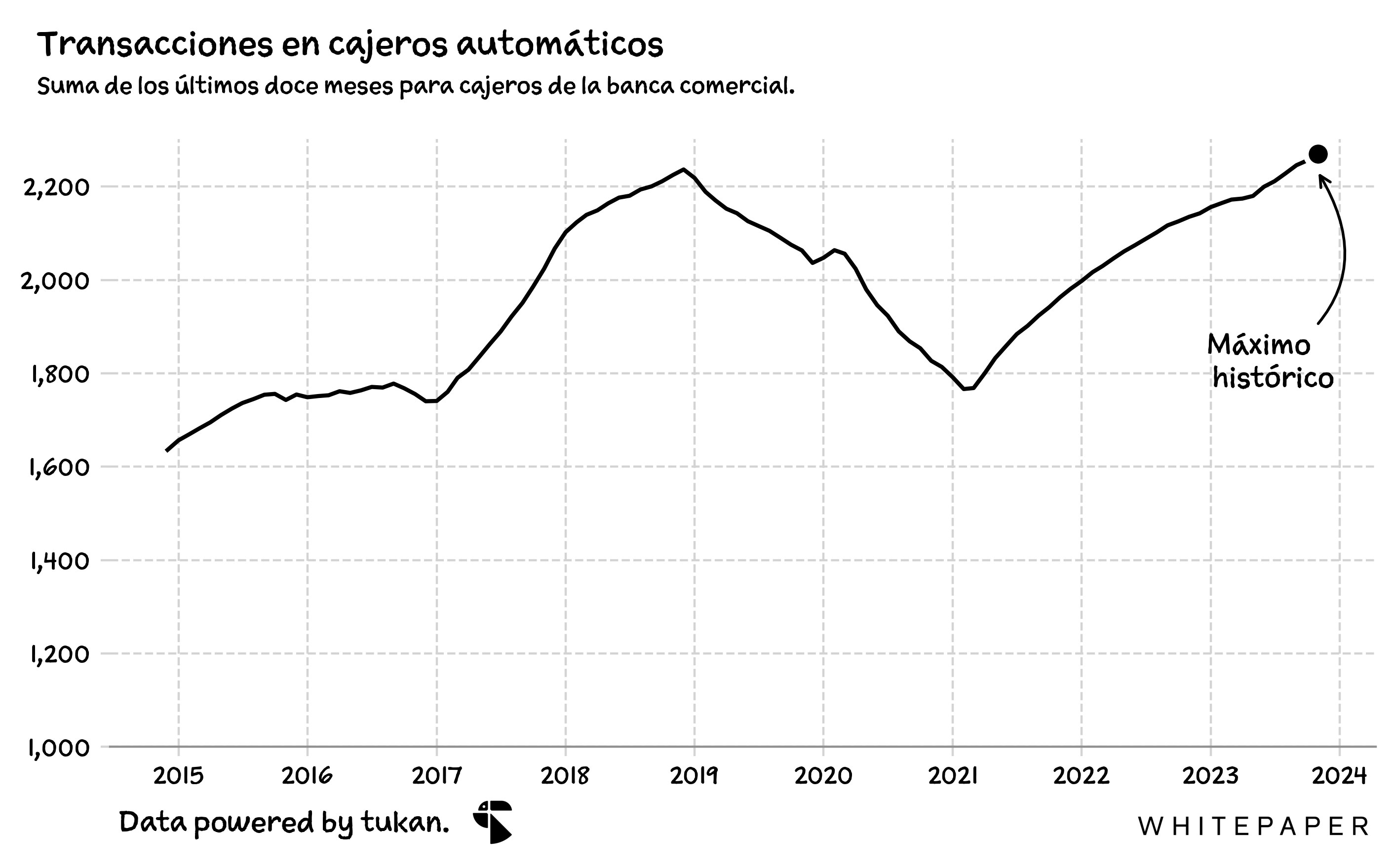 Entre enero y noviembre de 2023, la banca mexicana procesó poco más de 2 mil millones de transacciones a través de su red de más de 62 mil cajeros automáticos. Esto es equivalente a algo así como 4,300 transacciones por minuto en el país, y cerca de 100 operaciones diarias por cada cajero.
