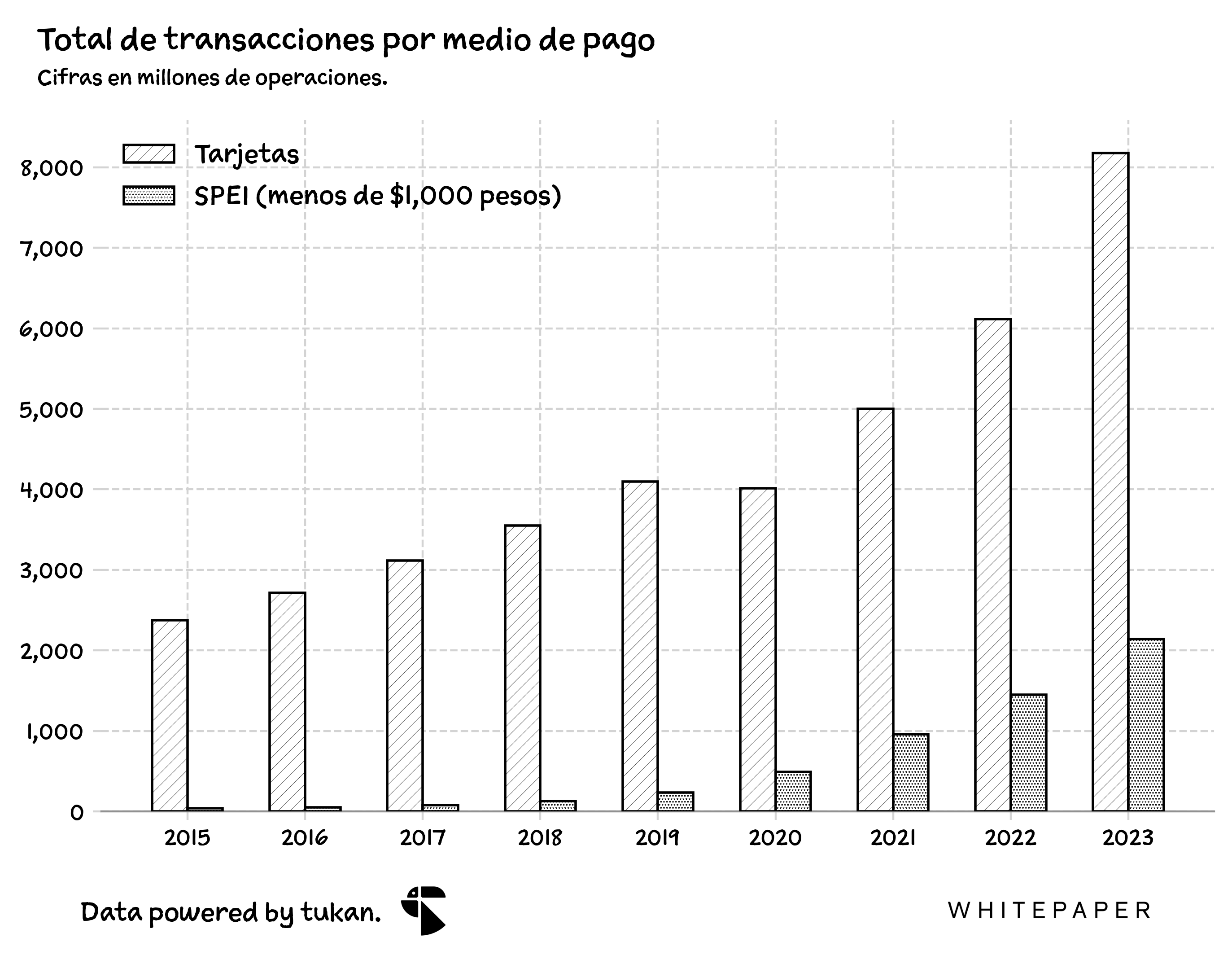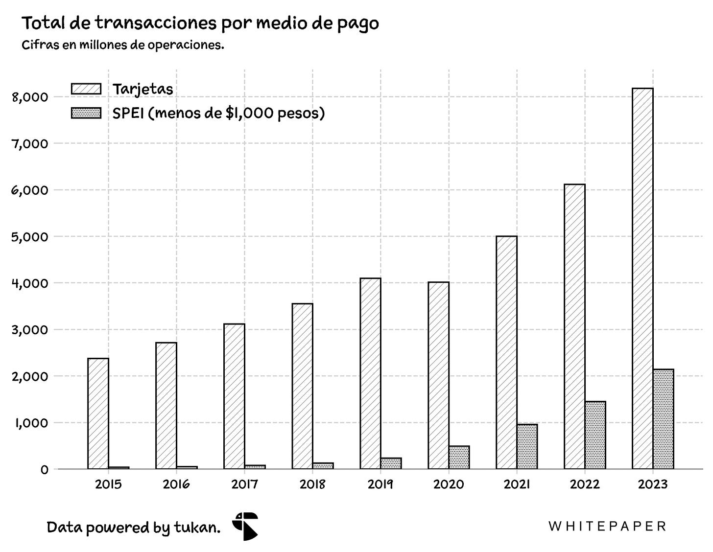 A nivel macro, la estrategia tiene todo el sentido. En los últimos ocho años, las operaciones con tarjetas en nuestro país han venido aumentado a tasas del 17% anual, rebasando más de 8,170 millones transacciones durante 2023; las transferencias SPEI de menos de mil pesos, por otro lado, ya superan las más de 2,140 millones de transacciones al año, y crecen a ritmos impresionantes del 65% anual. Además, ya prácticamente el 80% de la población adulta cuenta con un teléfono celular capaz de conectarse a internet y realizar operaciones bancarias en línea.