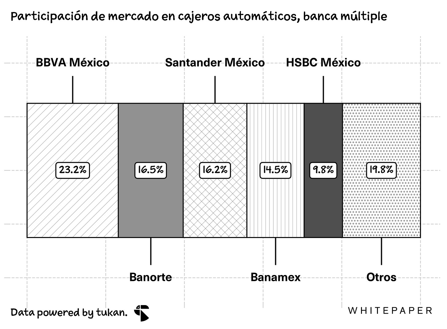Al cierre de noviembre del 2023, BBVA era dueño de cerca del 23% de los cajeros de la banca mexicana. Le siguen Banorte y Santander con el 16%, cada uno.