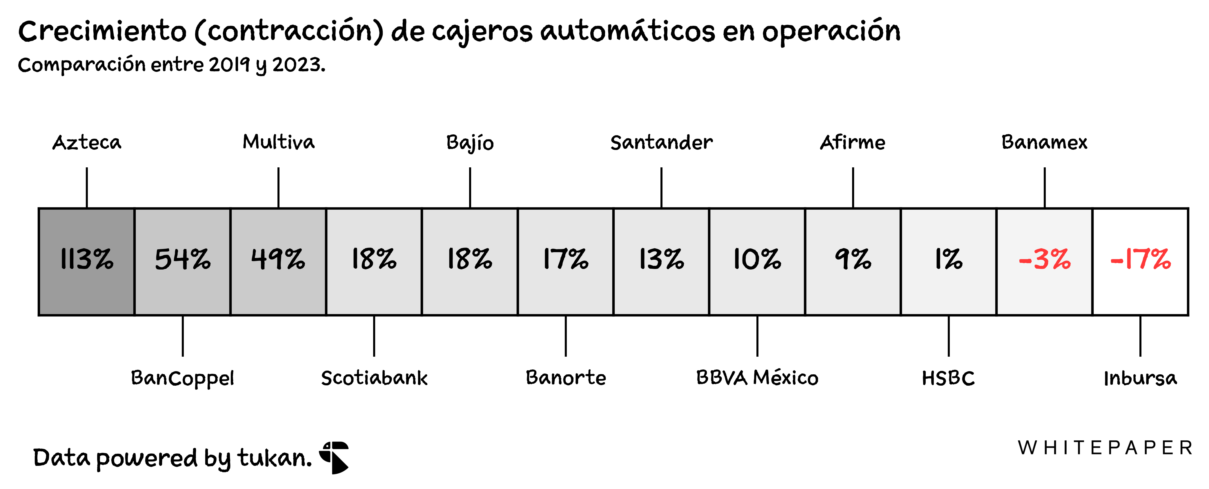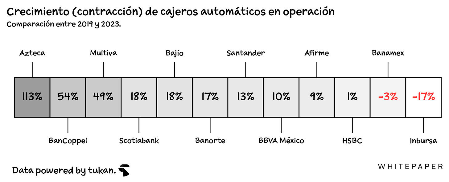 En los últimos 3 años, tan sólo dos bancos (con más de 500 cajeros), habrían reducido su oferta de este tipo de servicios en México. El resto habría ampliado la cantidad de cajeros en operación en un 16% en agregado. Dos de ellos —BanCoppel y Azteca— crecieron más de 50%.