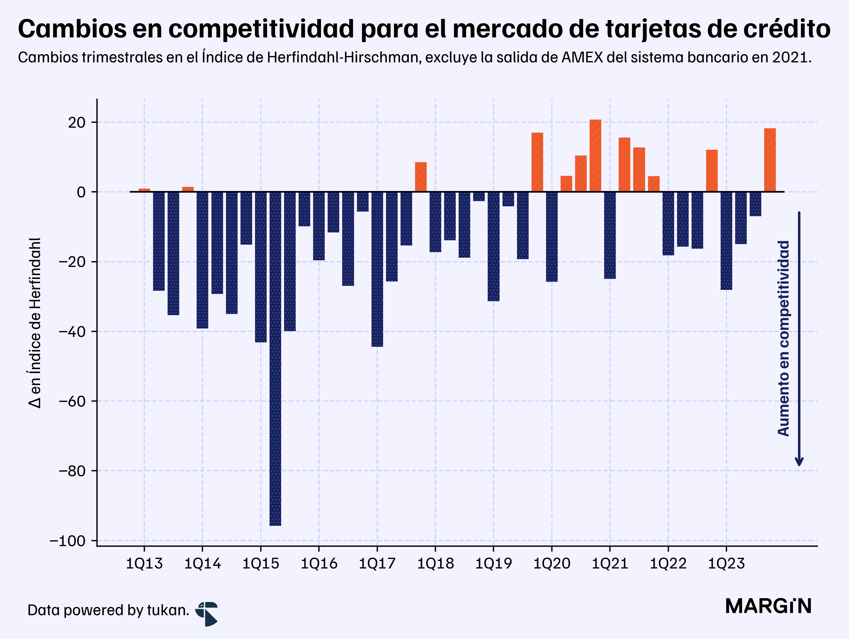 Excluyendo la salida de American Express del sistema bancario en 2021, los niveles de competencia en el mercado de tarjetas de crédito habrían estado mejorando de manera constante durante los últimos 10 años. Pasando de un IHH de más de 2,500 al cierre del 2013, a poco menos de 1,915 a finales del año pasado.2