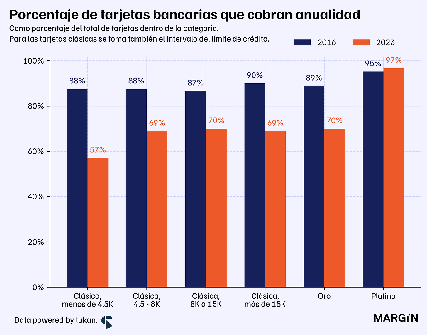 El porcentaje de tarjetas de crédito que cobran anualidad pasó de 88% a 57%. ¿Por qué? Analizamos cuáles son los productos con mayor nivel de competencia -y dónde hay oportunidad de disrupción.
