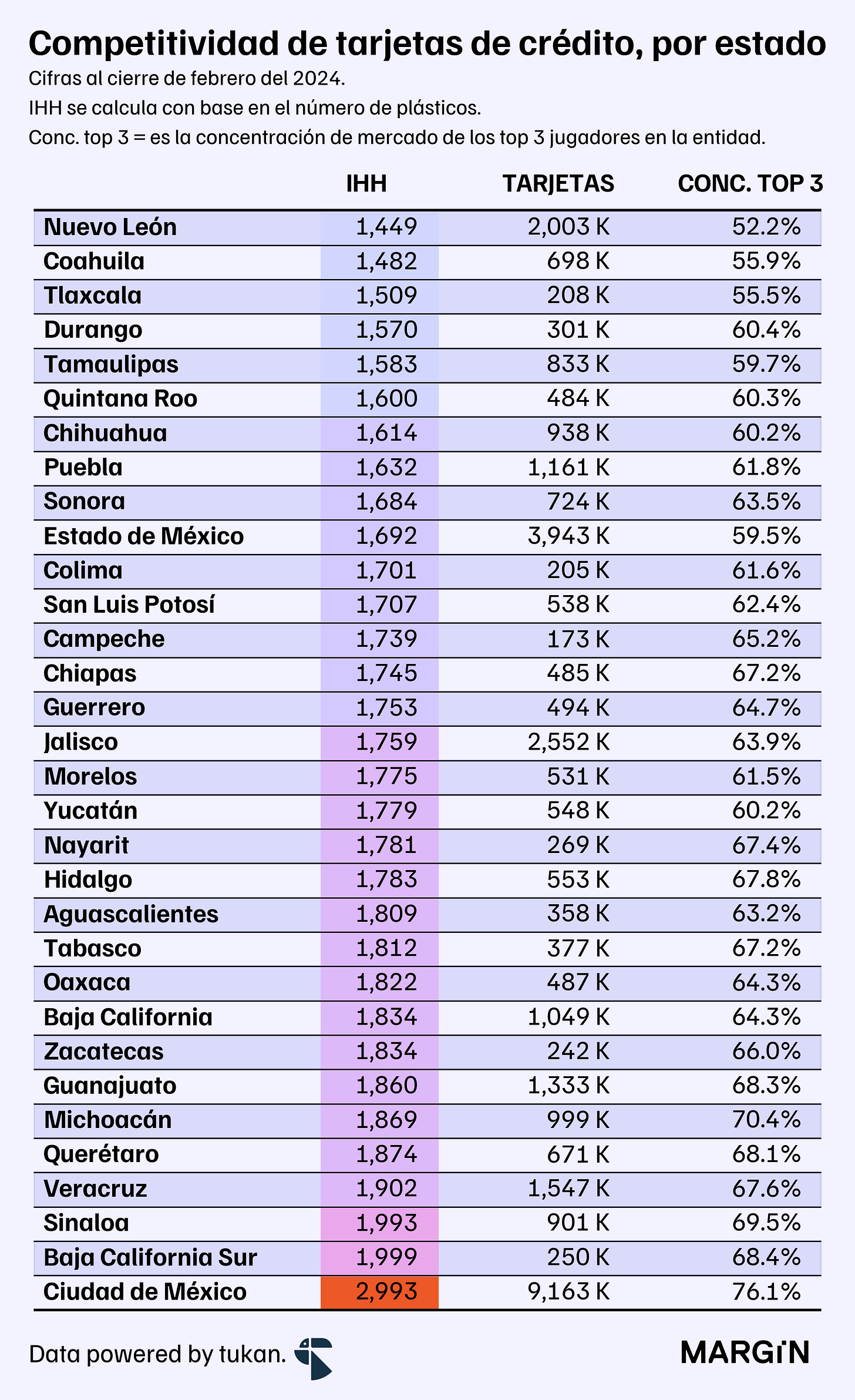 En contraste, la CDMX, Veracruz, Michoacán y Guanajuato resaltan como los mercados “más concentrados” (y con más de 1 millón de tarjetas en el mercado). Para la capital del país destaca el hecho que más de tres cuartas partes de las tarjetas (bancarias) estarían en manos de los 3 jugadores más importantes en la entidad — cifra considerablemente superior al 52% que se observa del otro lado de la tabla, en Nuevo León.