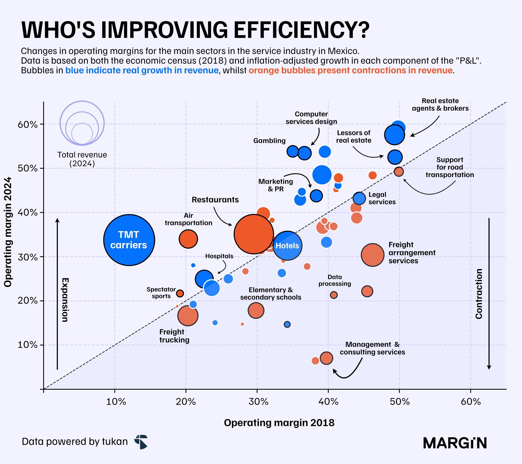 At an aggregate level, we identify TMT, gambling and computer services design (software) as some of the industries with the highest overall margin expansion within the country. In the following chart, we present 2018 vs 2024 operating margins for each of the 58 industries tracked by the Mexican Statistical Institute.