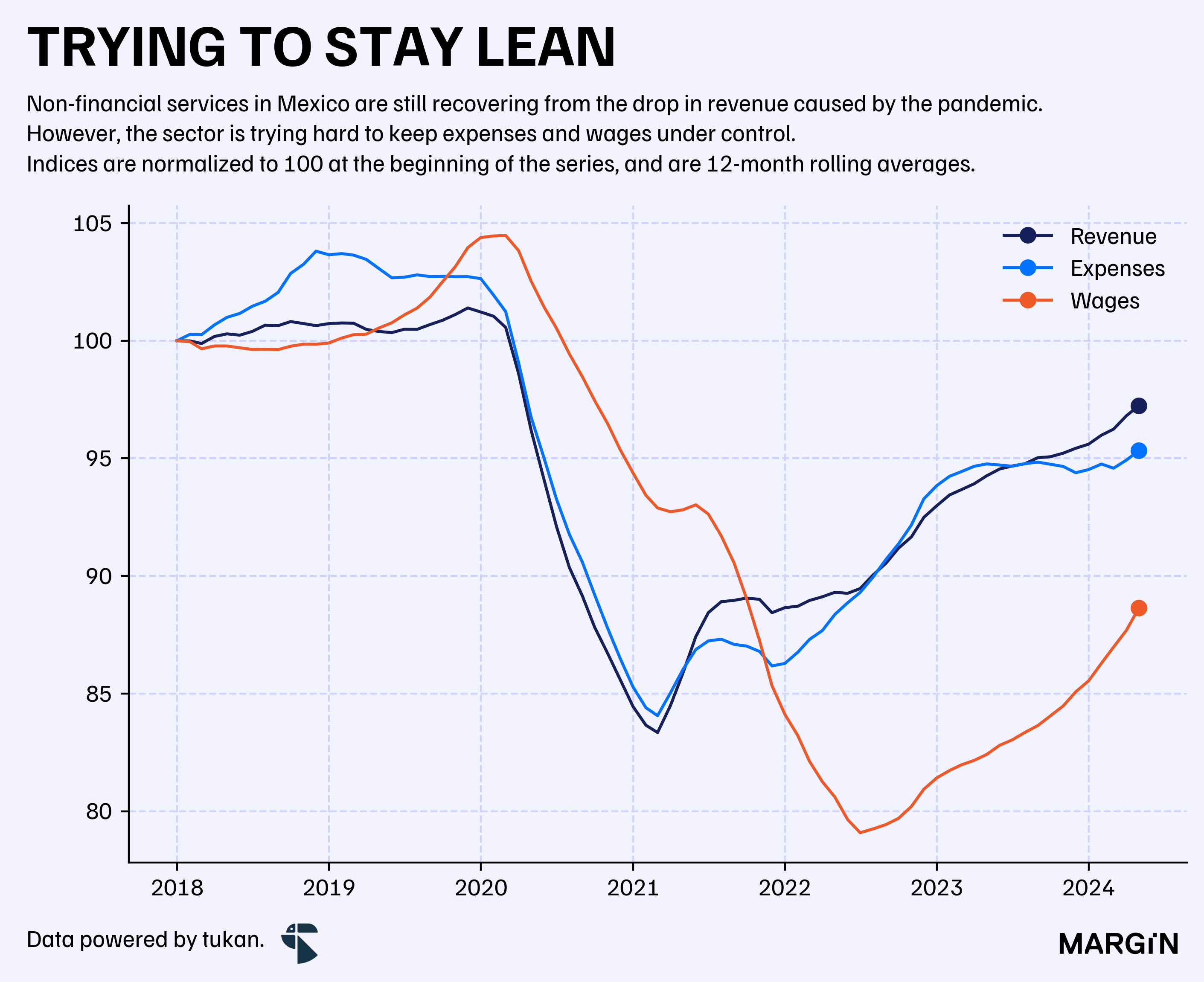This situation has forced Mexican service businesses to significantly reduce total costs — and in particular — wages to its employees. As of 2024, total wages and operating expenditures are down 15% and 8% from their peaks in 2020 and 2018, respectively, dropping below income levels and thereby improving overall operating margins for companies.