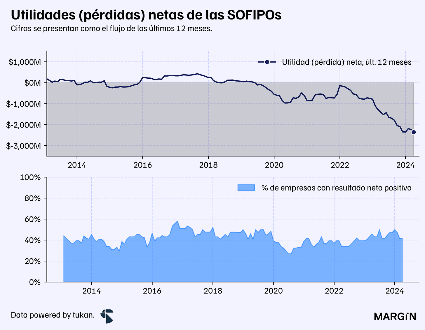 Entre abril del año pasado y marzo de este año, las Sociedades Financieras Populares habrían registrado una pérdida de más de $2,300 millones de pesos (en conjunto); con 21 de las 36 empresas que monitorea la Comisión habiendo reportado flujos negativos en su bottom line durante este periodo.