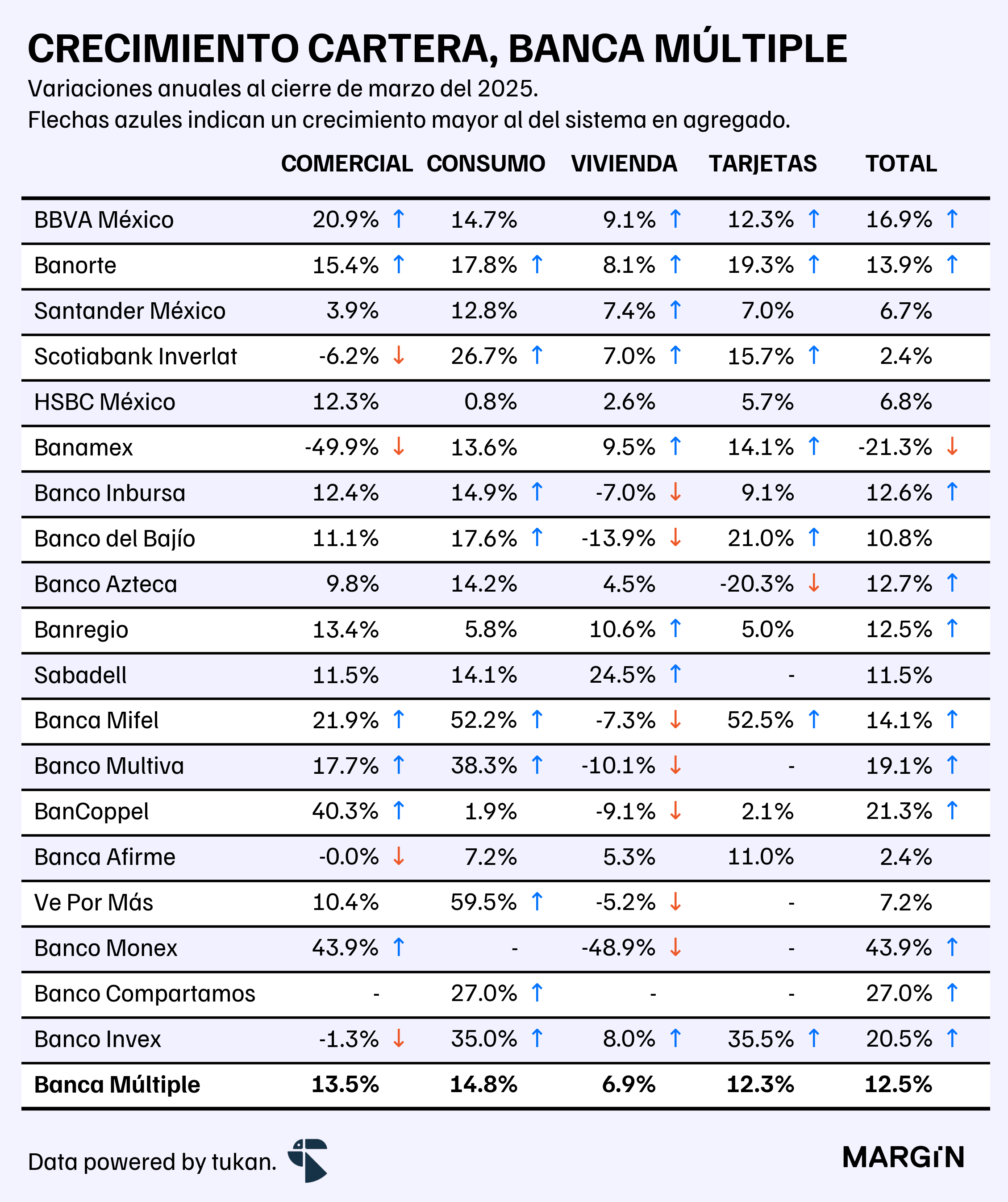 De entre los bancos del “G8”, solo BBVA, Banorte e Inbursa reportaron crecimientos de doble dígito en sus portafolios.