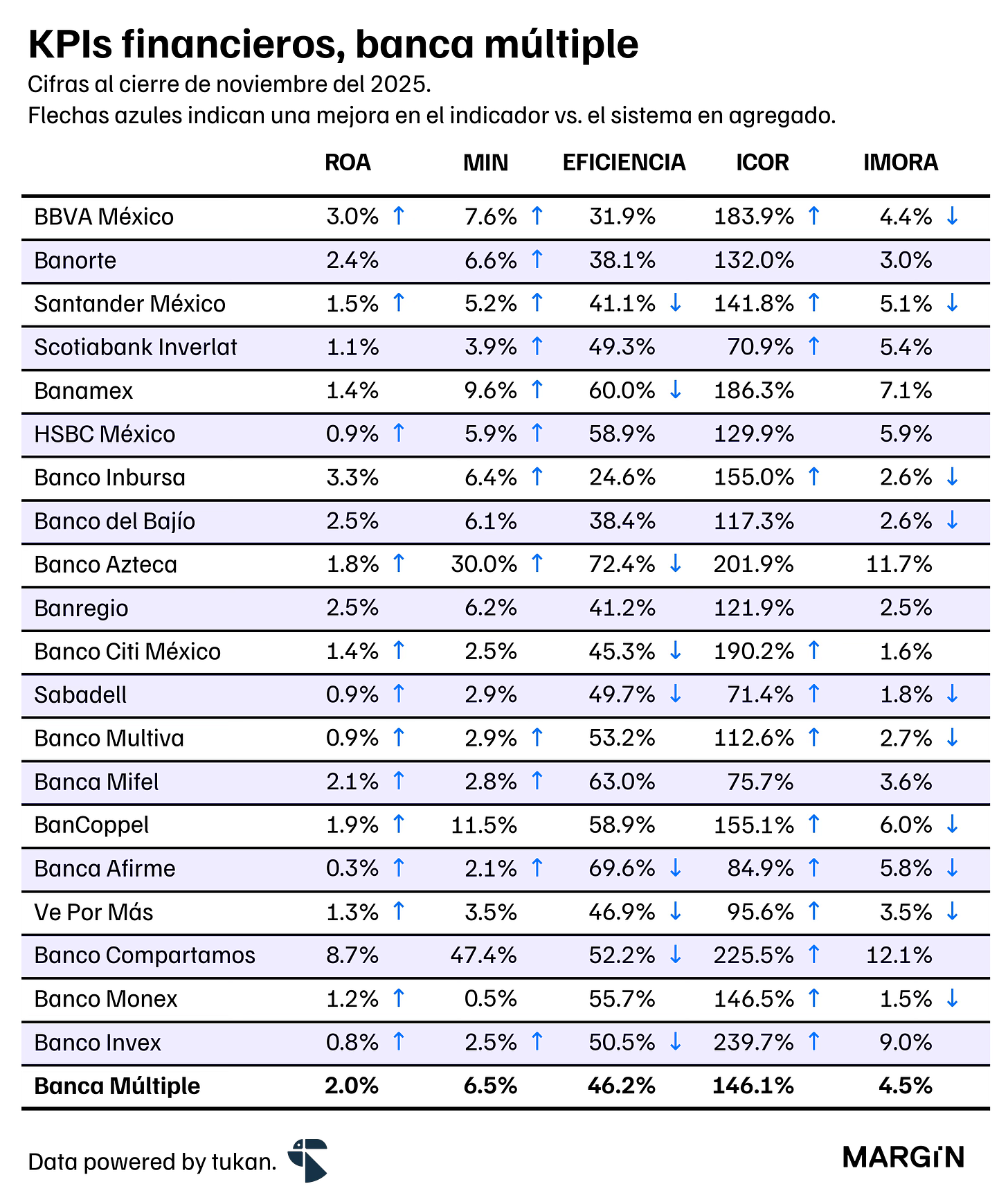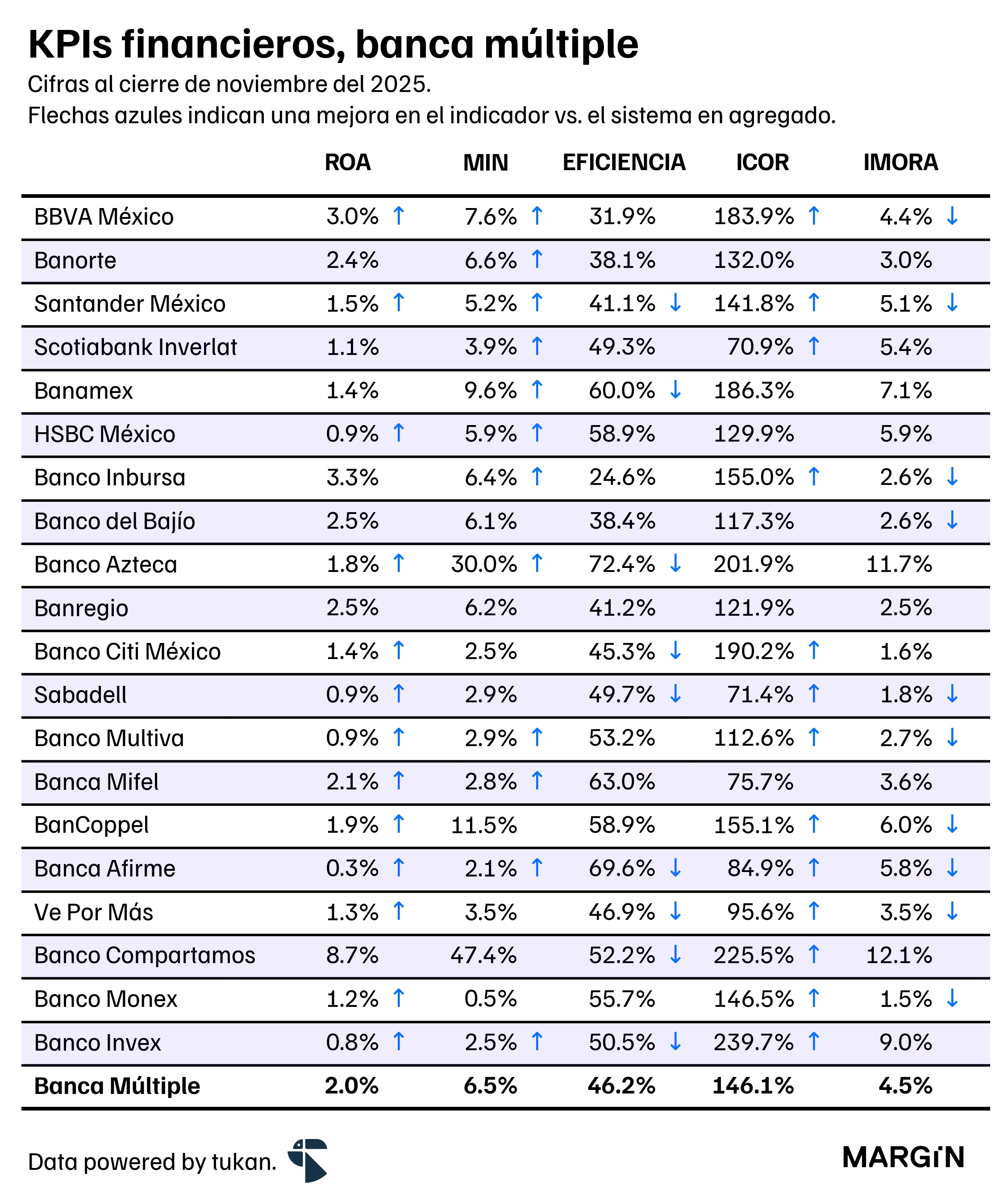Al cierre de noviembre, las utilidades de los últimos doce meses (UDM) de los bancos sumaron $300,000 millones de pesos (2.7% a/a). Destacó una mejora sustancial en el índice de eficiencia del sistema, impulsada por un incremento de 6.7% en los gastos de administración y promoción, que se vio superado por un alza del 8.4% en los ingresos de las instituciones bancarias.