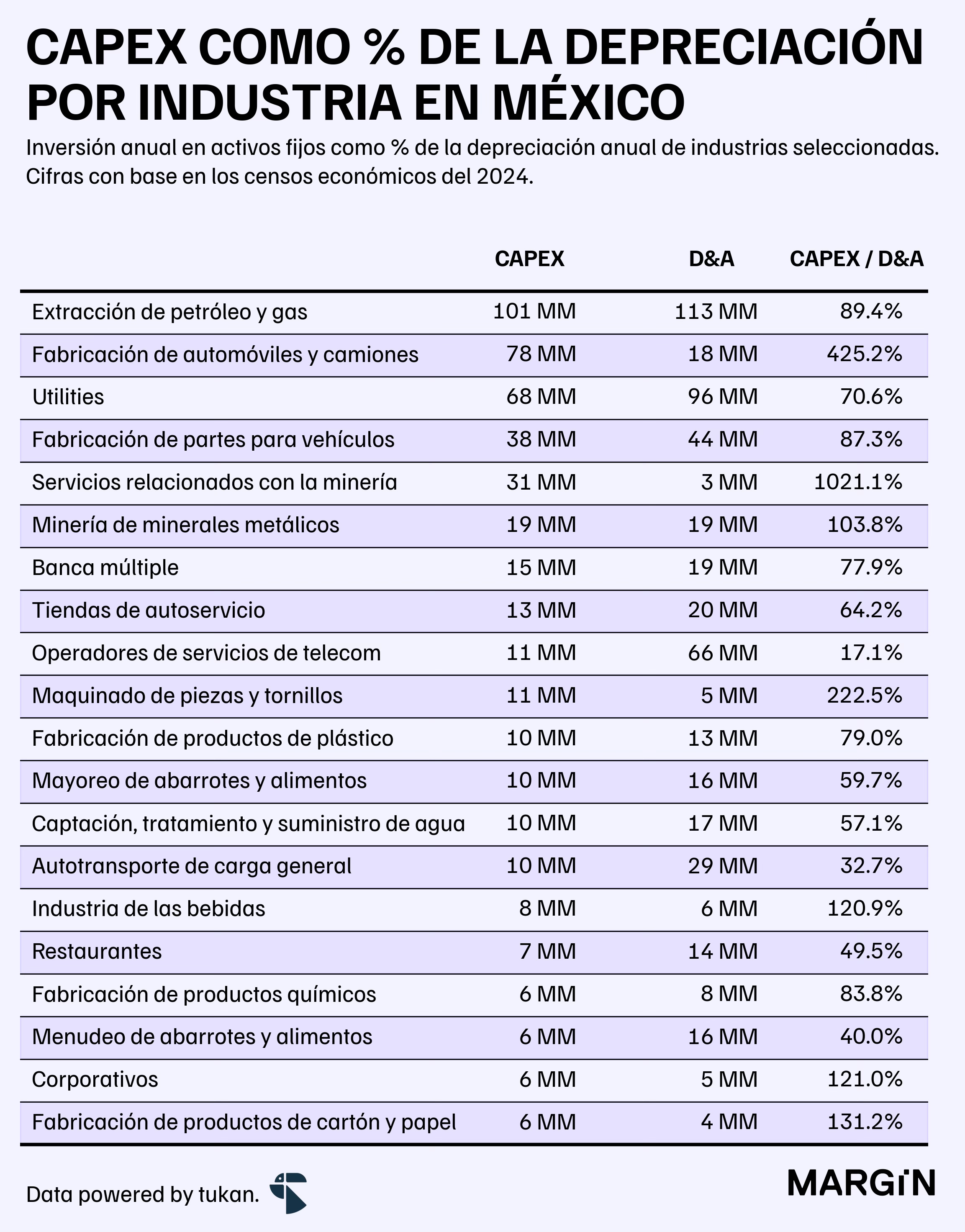 Con base en cifras del último censo económico, detectamos que únicamente 4 de las 10 industrias más grandes en cuanto a activos fijos tendrían un razón de más del 100% en su ratio de CAPEX / Depreciación.