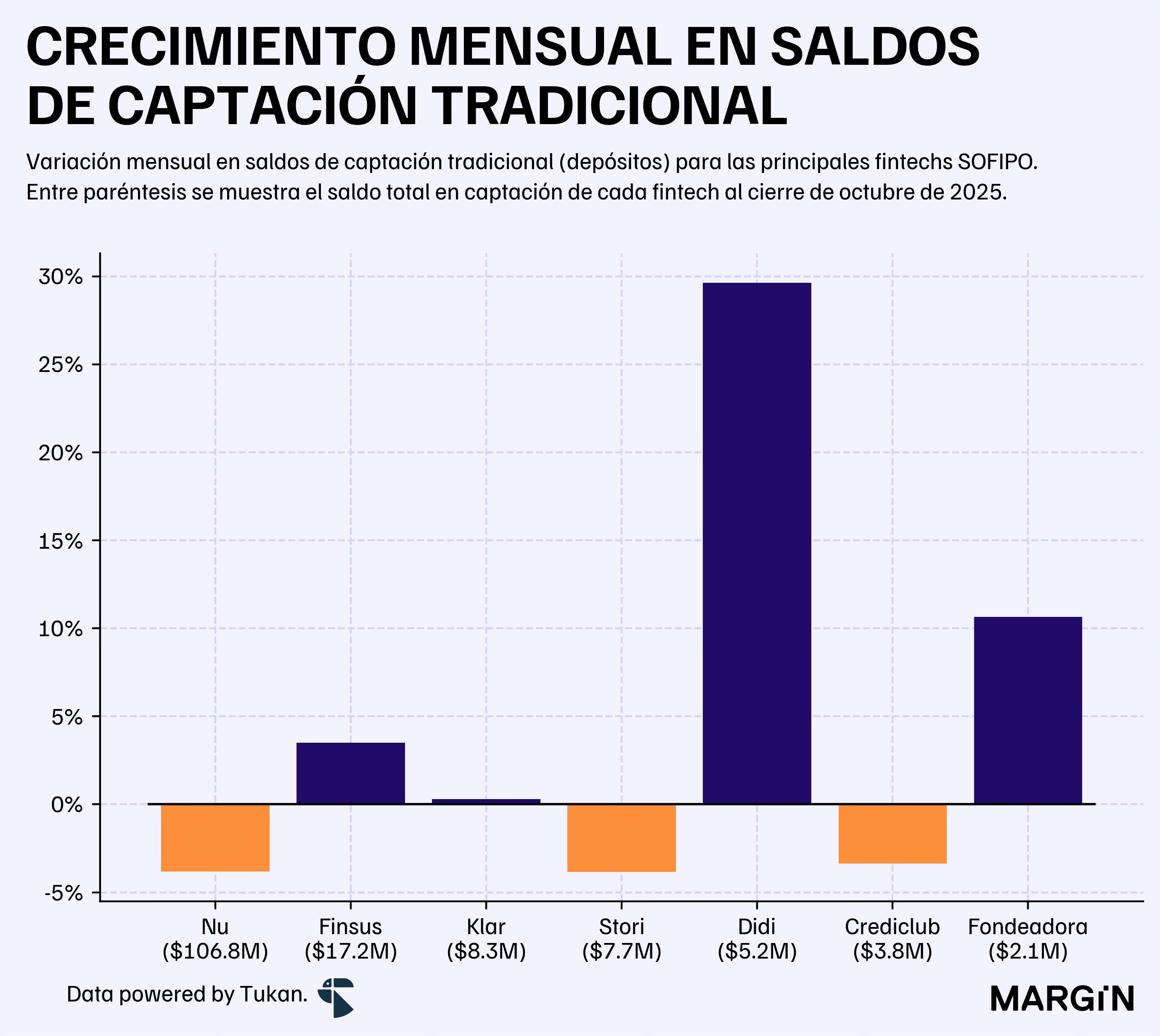 Del lado del balance, el agregado de los saldos de captación de las principales empresas del sector se contrajeron en un 1.7% de manera secuencial. Tres de ellas redujeron sus saldos en alrededor de 3.5%, mientras que Didi, Klar y Finsus destacaron por expandirse (o mantener) su saldo.