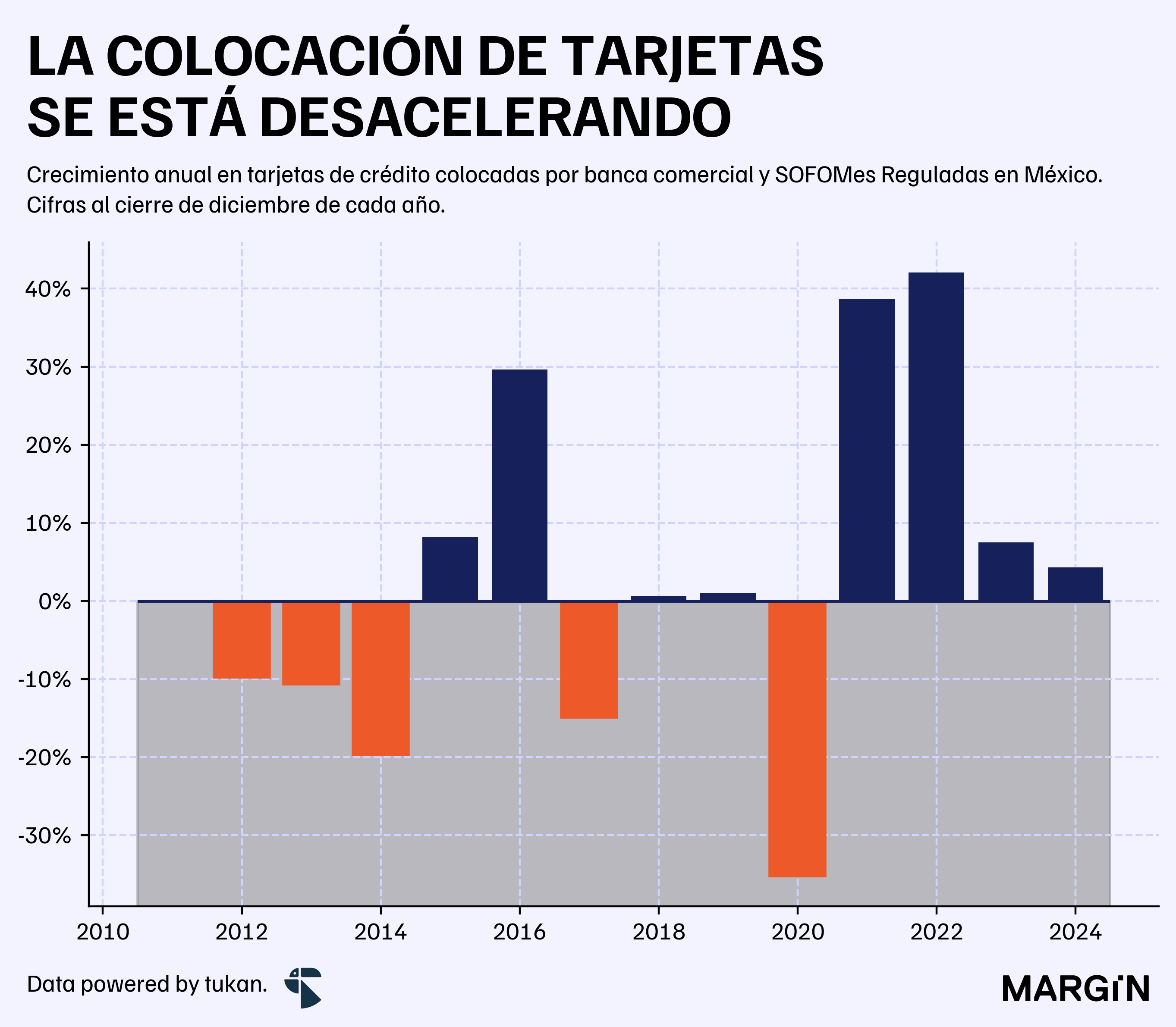 Según datos del Banco de México, durante el 2024 los bancos comerciales y las SOFOMes Reguladas colocaron 7 millones de tarjetas de crédito en México — cifra 4% superior a la registrada durante el año pasado, presentando una desaceleración importante con respecto a las cifras del 2023 y 2022.