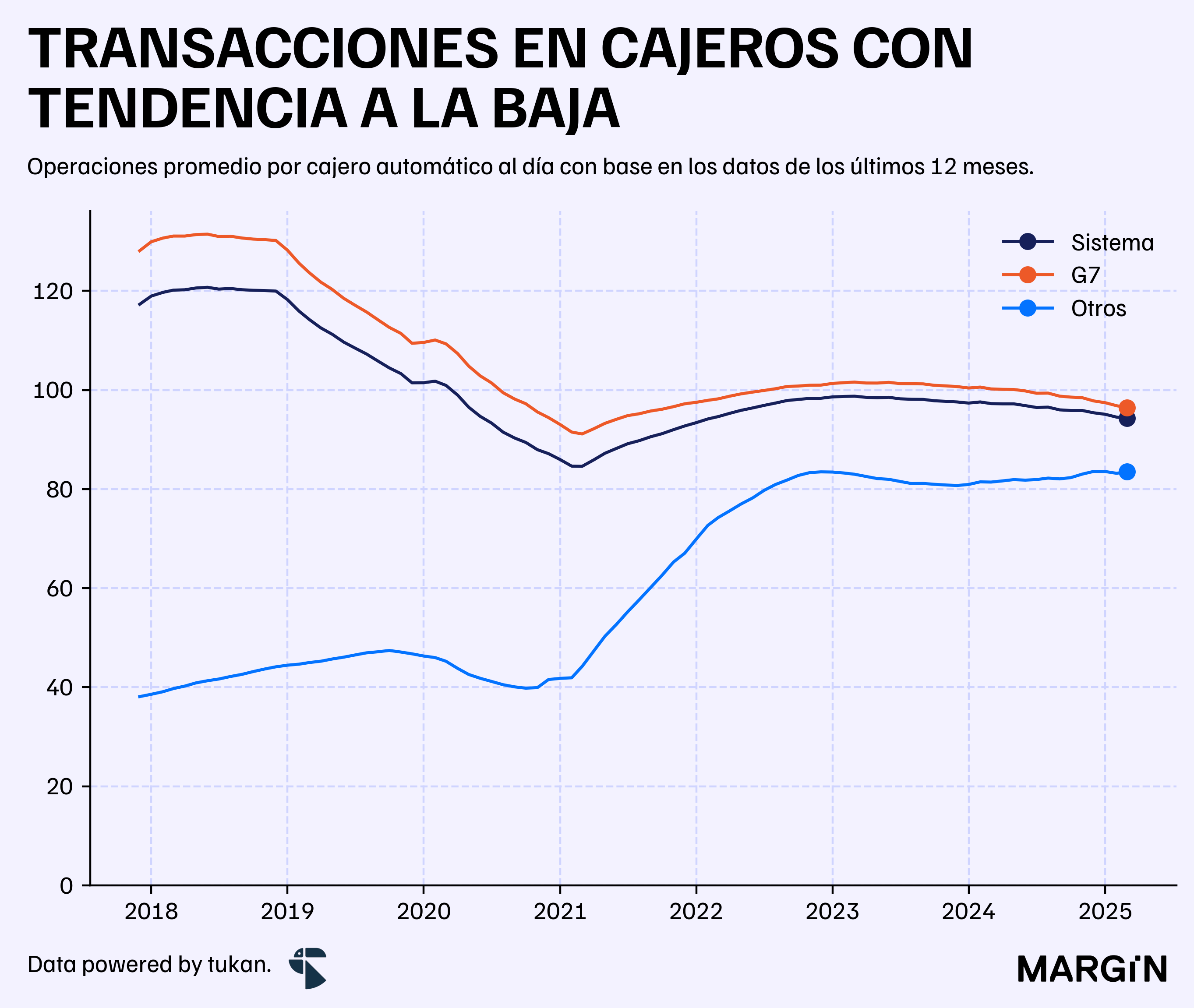 De acuerdo con datos de la CNBV, los bancos del G7 y el sistema en general estarían siendo utilizados cada vez menos (en promedio) — mientras que los cajeros de bancos fuera del G7 estarían siendo utilizados cada vez más.
