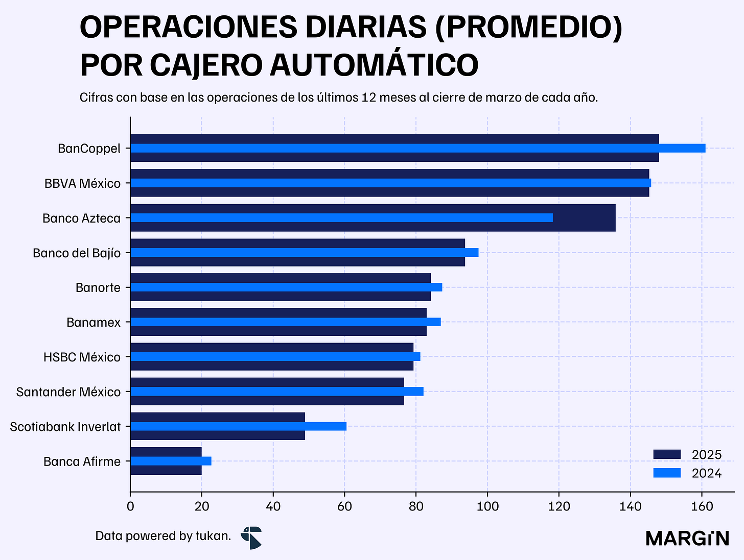 Entre los 10 bancos con mayor cantidad de cajeros, BanCoppel sería el banco que mayor operaciones tendría por cajero, sin embargo, el uso (promedio) de cada cajero individual se habría contraído en más de 8% año contra año.