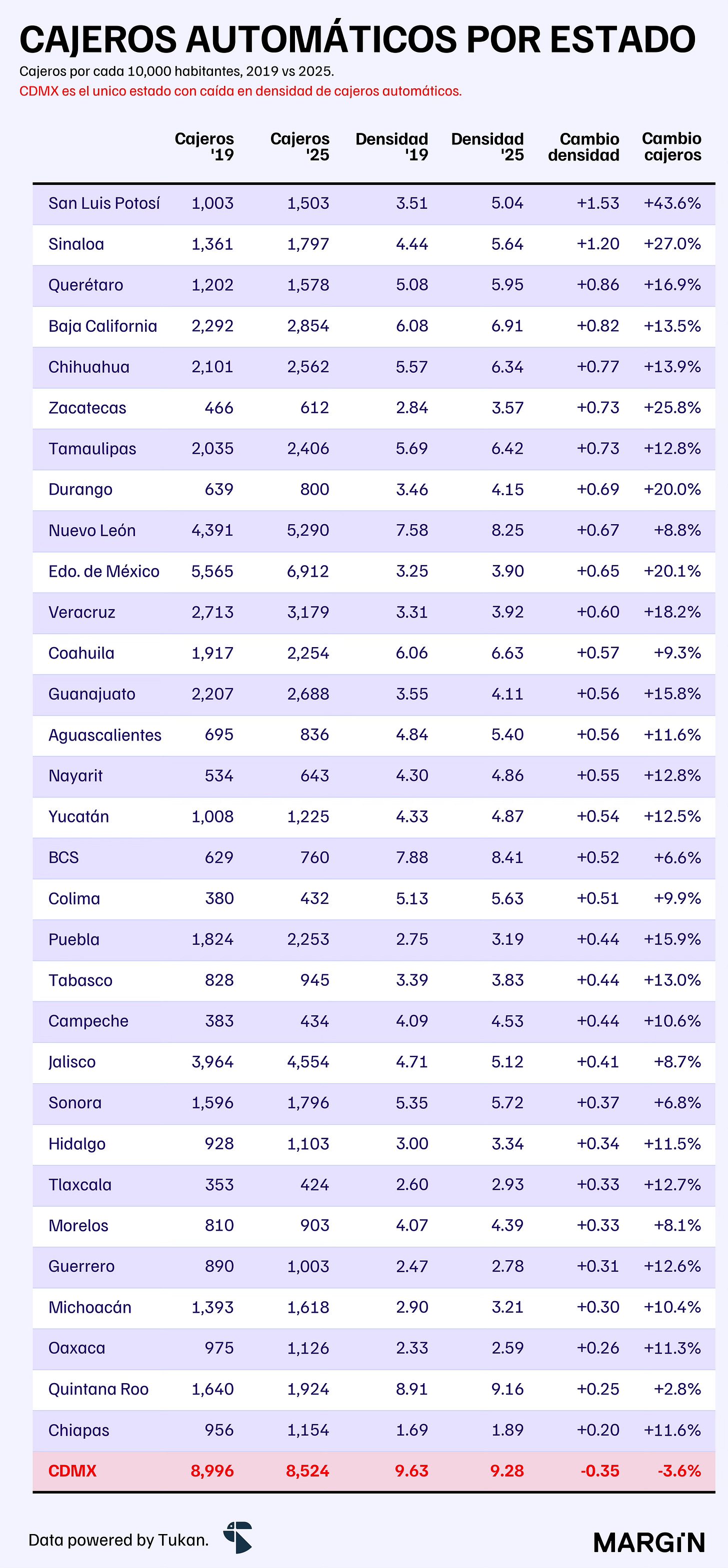A nivel estatal, únicamente la Ciudad de México — donde hay cerca de 9 cajeros por cada 10,000 habitantes — estaría reduciendo la cantidad de cajeros en su territorio.