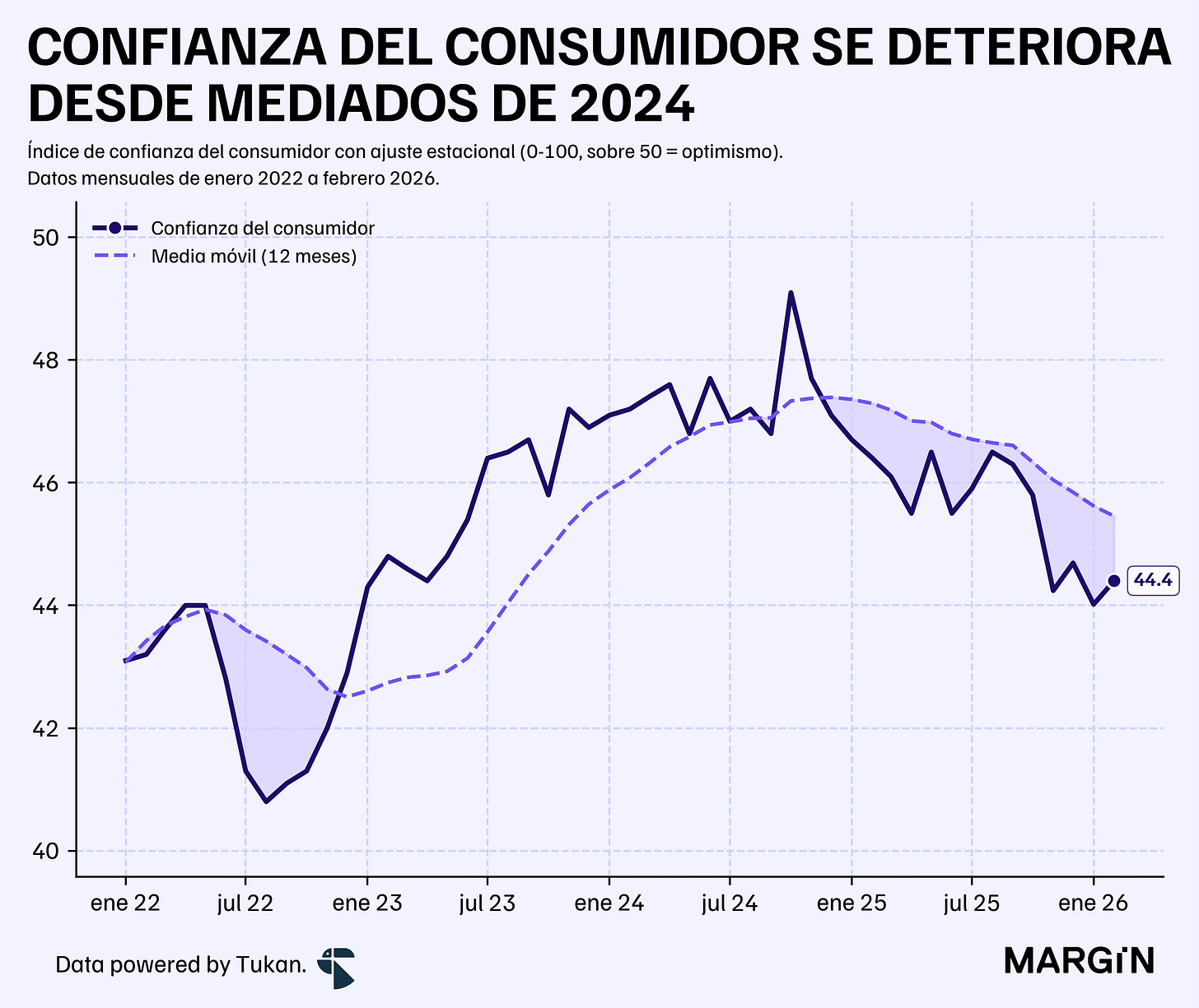Comparando las cifras del INEGI de forma anual, esta sería la 14va caída consecutiva en el índice de confianza del consumidor en el país — una de las rachas más largas de los últimos 5 años.