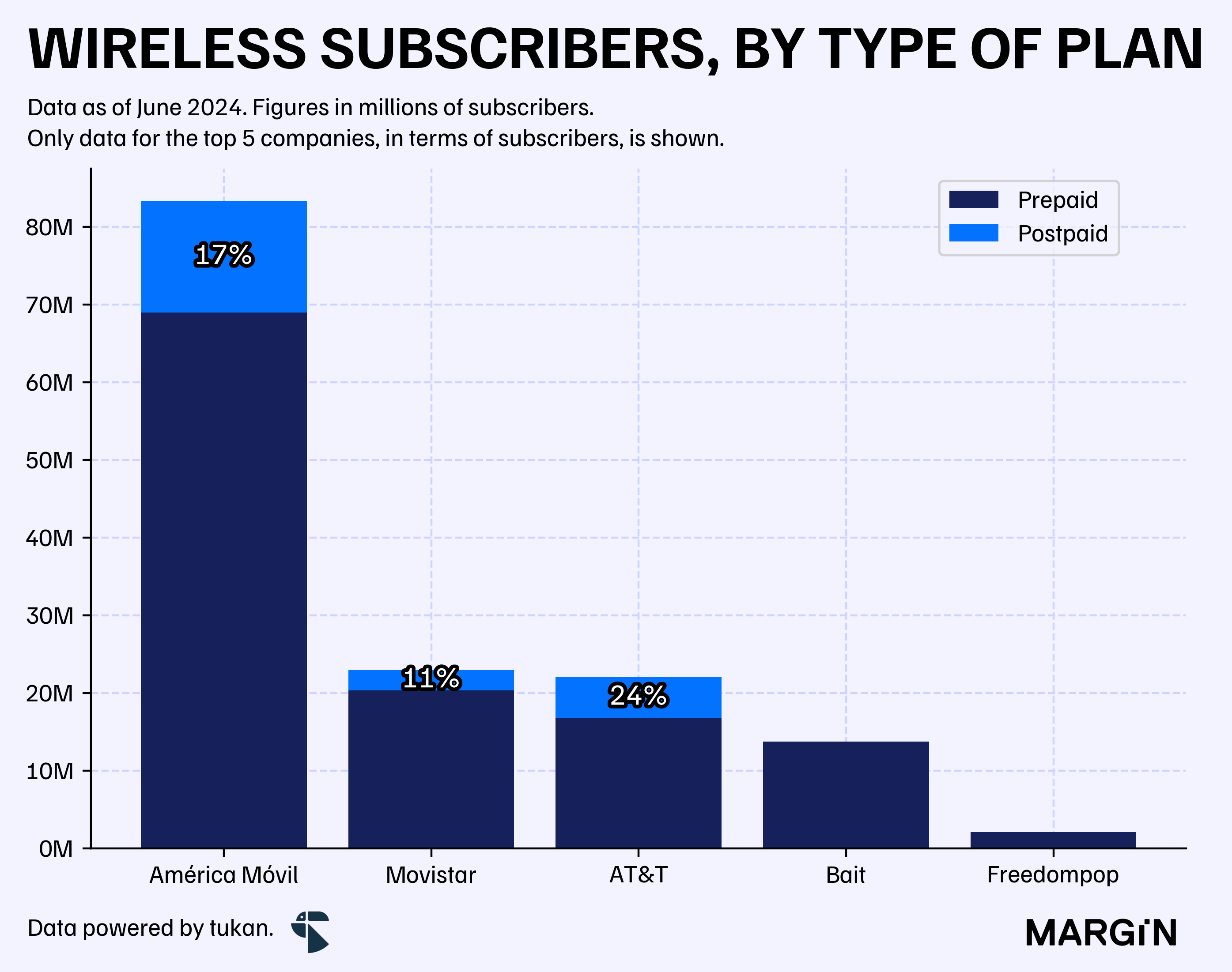 Regulatory data shows that among the five companies with more than 1% market share in Mexico, AT&T has the highest exposure to postpaid subscribers. As of June 2024, postpaid clients accounted for approximately 23% of AT&T’s portfolio.