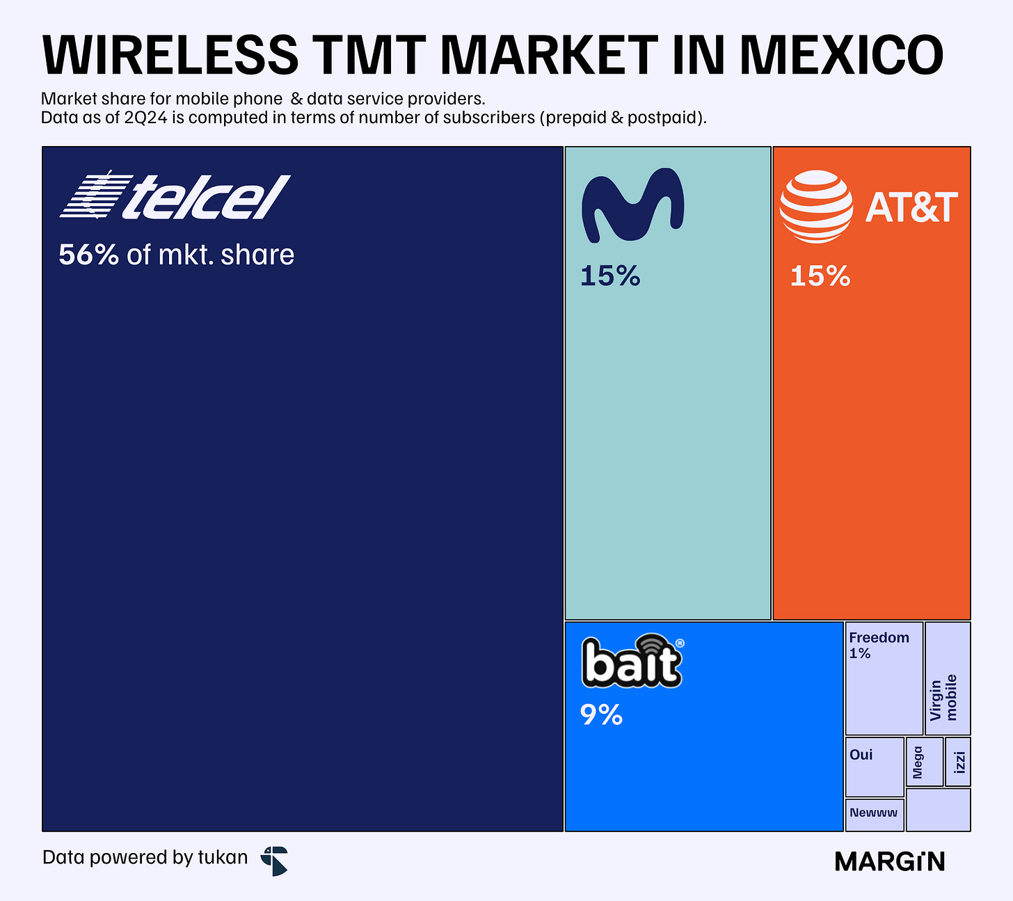 Since 2015, AT&T’s market share in Mexico reached a peak of 16.2% in September 2023 but has since declined to 14.8%. This decrease is primarily attributed to intensified competition from well-funded mobile virtual network operators (MVNOs) such as Bait (Walmart), izzi Móvil (Televisa), Oui (Grupo Salinas), and Mega Móvil (Megacable).