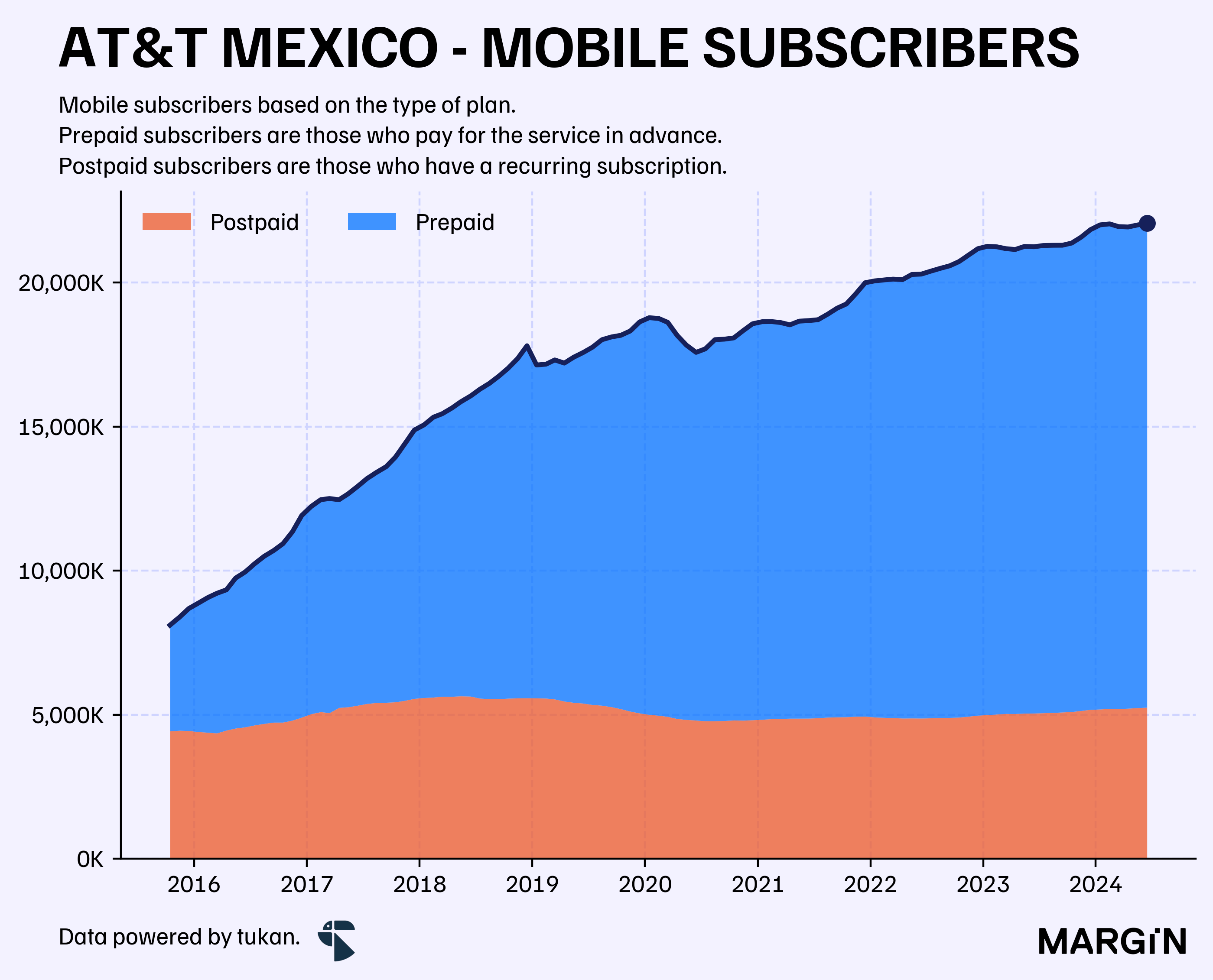 According to data from the Mexican regulator (IFT), AT&T’s subscriber base has grown at a compound annual growth rate (CAGR) of 12% since their entrance into the Latin American market. This growth has increased the total number of customers from 8 million at the end of October 2015 to over 22 million as of the second quarter of 2024.