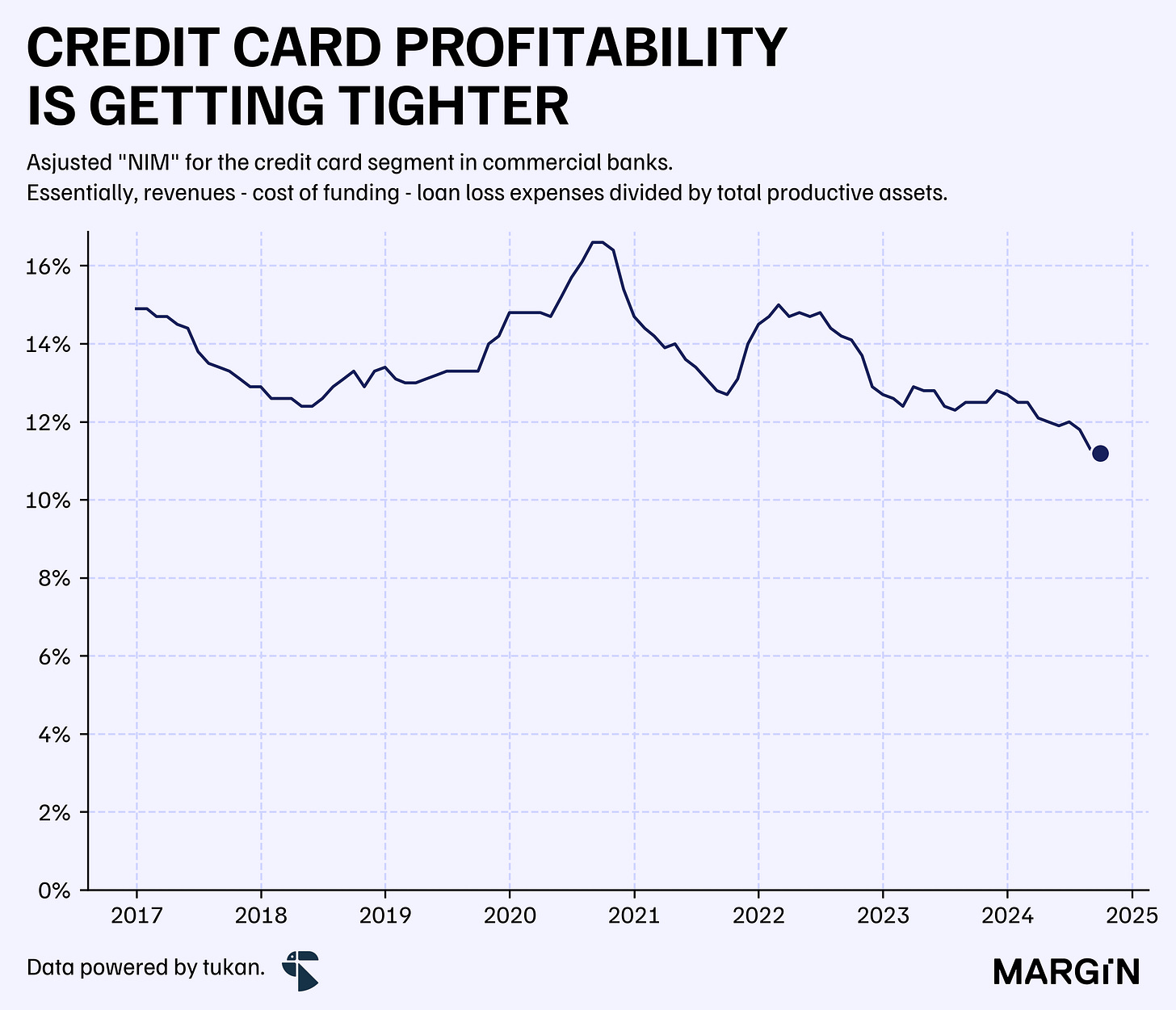 To address these questions, we estimated an “adjusted net interest margin (NIM)” specifically for credit cards. For details on our methodology, we’ve included a spreadsheet at the end of the article, available exclusively to our paid subscribers.
