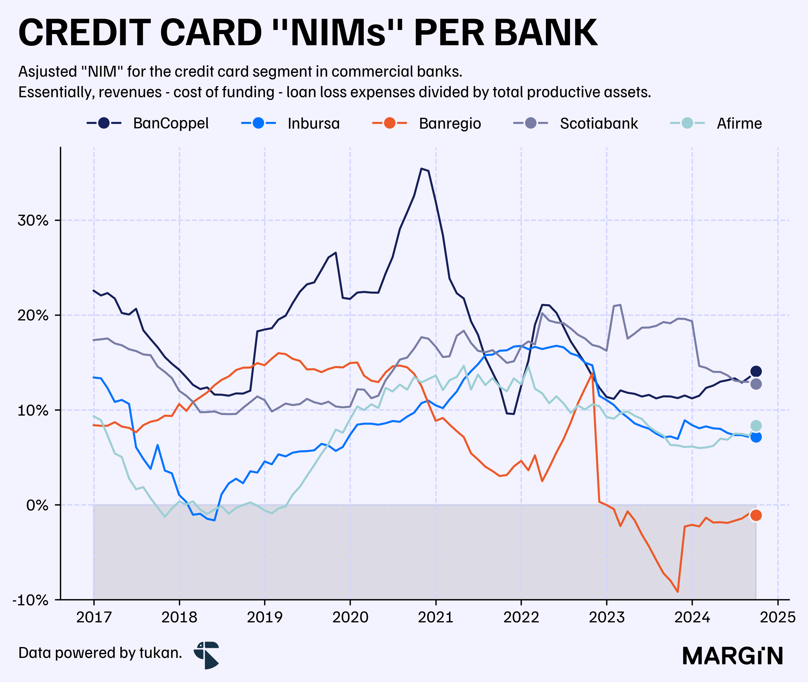 According to our estimates, the “net interest margin” for credit cards, adjusted for loan loss provisions, stands at 11.4% for the commercial banking system as a whole. This represents a decline of 113 basis points compared to the previous year and nearly 500 basis points below the historical high observed in 2020.
