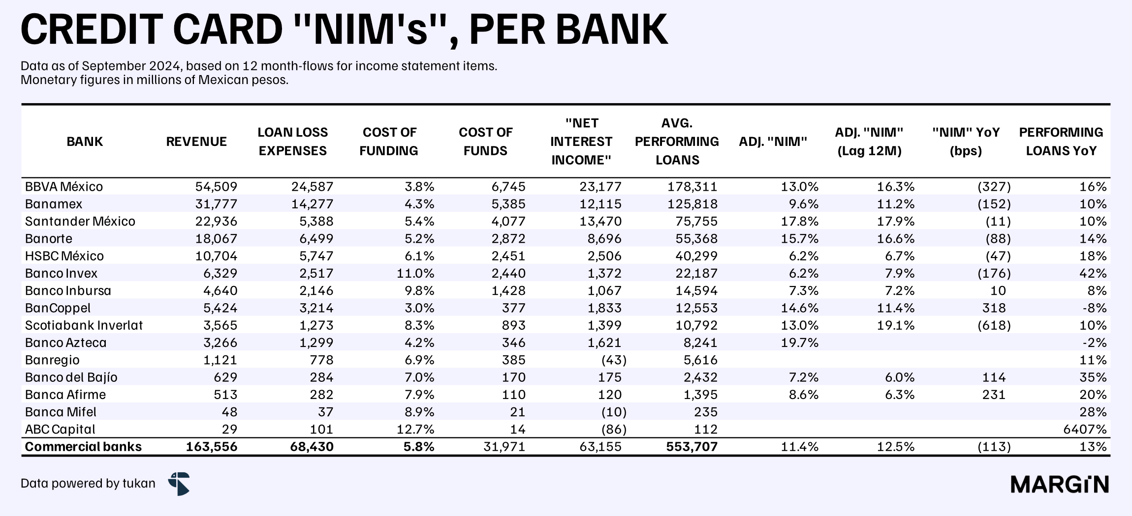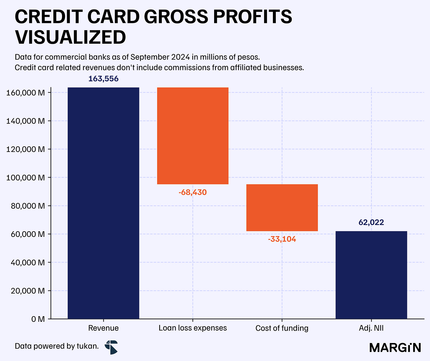 Not surprisingly, established banks which have been betting heavily on growing market share across the credit card line have also the lowest “NIMs”. Ualá and Banregio also stand out by recording negative net interest income for the product.